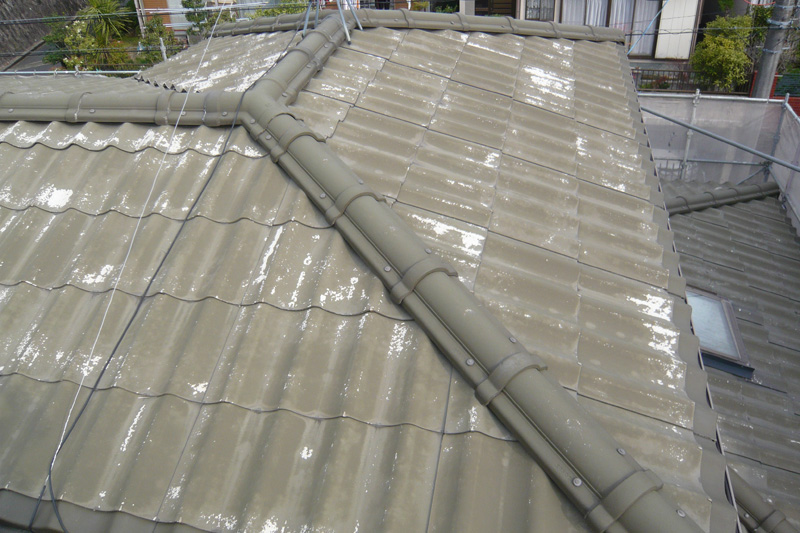 斜面に建ち大きいモニエル瓦が目立つお宅だったので、グリーン系の色で仕上げアクセントをつけました。